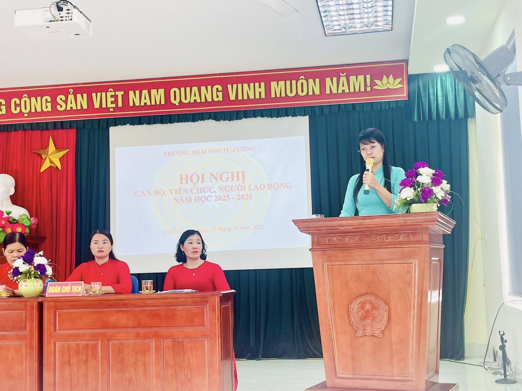 Hội nghị Cán bộ, viên chức, người lao động trường MN Tự Cường được tổ chức vào buổi sáng ngày 15/10/2025 nhằm đánh giá việc tổ chức thực hiện nhiệm vụ năm học 2024-2025, triển khai nhiệm vụ năm học 2025-2026. Thảo luận về các báo cáo, quy chế cơ quan, quy chế dân chủ ....và đưa ra các giải pháp thực hiện tốt các mục tiêu kế hoạch năm học 2025-2026 đã đề ra.